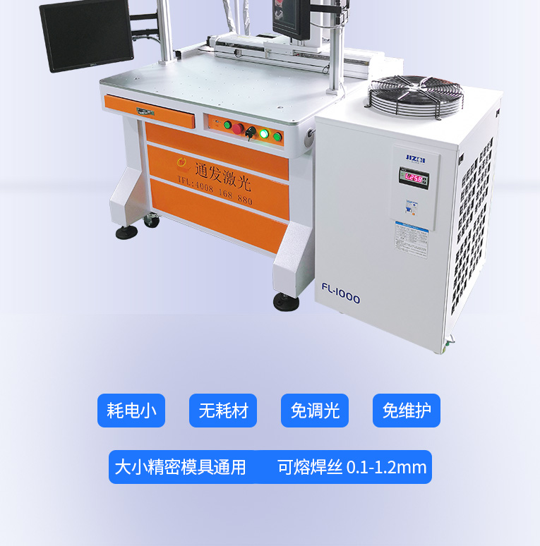 1、采用光纖激光器,反射率高,能量強(qiáng),免維護(hù),免調(diào)光,功耗少,相比傳統(tǒng) 模具焊來說,體積小,安全,穩(wěn)定性好超長使用壽命。